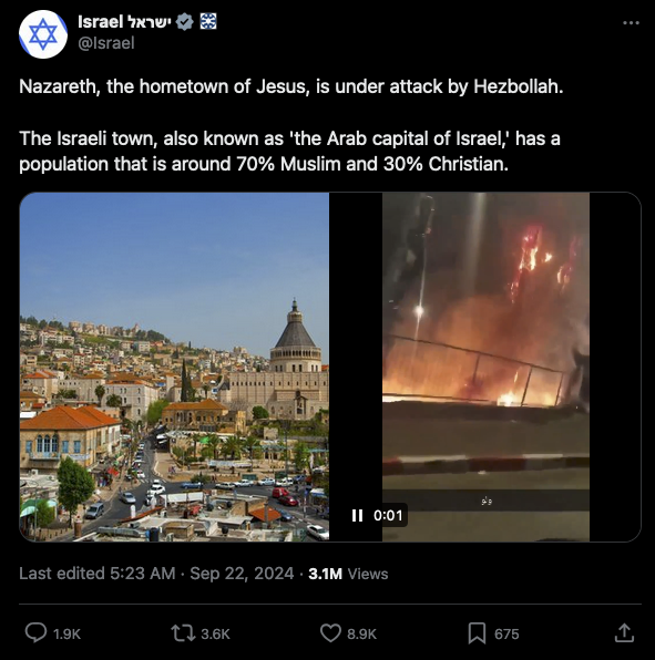 On September 21st 2024, the official Israel account on the fascism petri dish that is Elon Musk's X posted the following: "Nazareth, the birthplace of Jesus, is under attack by Hezbollah. The Israeli town, also known as 'the Arab capital of Israel,' has a population that is around 70% Muslim and 30% Christian."
