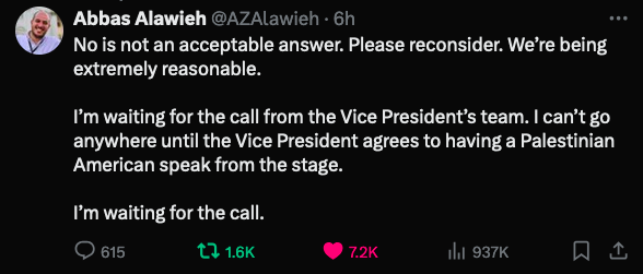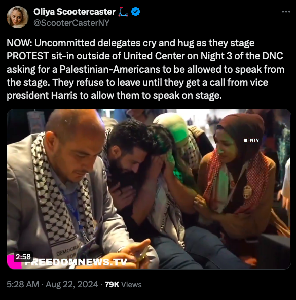 The Democrats are refusing to hear a vetted speech - one they already approved - by Abbas Alawieh, a Palestinian-American delegate, ie one that was voted by Democrats to attend the DNC. They are excluding the doctors at the DNC who have worked in Gaza and described it as hell on Earth. They are excluding the dozens of Jewish-American groups urging them to abandon Netanyahu and prioritize a permanent ceasefire instead. As Dan Berger pointed out, this comes sixty years after the Democratic Party refused to seat the Mississippi Freedom Democratic Party, the party that was co-lead by Fannie Lou Hamer, the same Fannie Lou Hamer that the Democrats at the 2024 DNC keep on bringing up and praising. In her speech, Hamer said “if the Freedom Democratic Party is not seated now, I question America.” The Democrats are making the same mistake today even as they praise the woman they previously excluded.