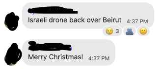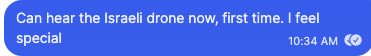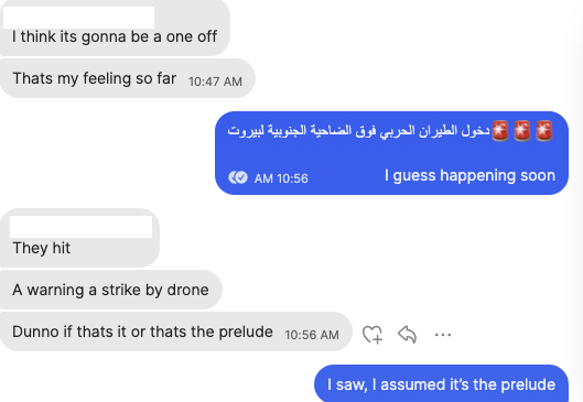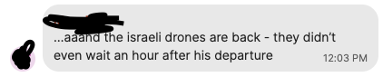When the drone is followed by a strike, my phone buzzes. You never know when it can happen, so I have found friends reflecting on all those moments where it feels like, maybe, probably (?), it might happen today. The drone is louder than usual, whatever usual means, so that must mean today is the day. Sometimes it is, sometimes it is not. A friend was going out, heard the drone, and decided to wait it out. It turned out that staying at home was worse, so he told himself fuck it and went out. Going out is some act of defiance now, even if you're going out to drown yourself in booze or whatever. It's not really, of course. We have no idea if this makes any difference to the drone operators, let alone the genocidaires giving them orders.