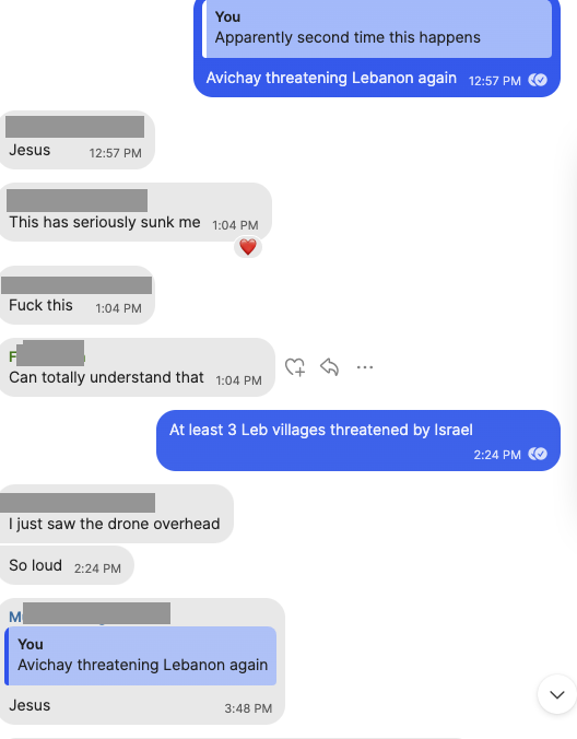 But of course, Israel does not stop. Nothing stops Israel because its allies have long benefited from having this quasi-outpost in the Middle East test out its weapons on us (and keep in mind that, whatever the Israelis do in Lebanon, they always do worse in Gaza.) So, after some time, the social media posts stop, the Signal/Whatsapp updates stop.