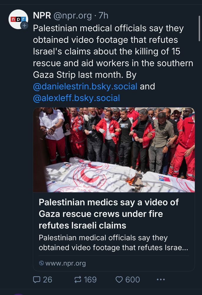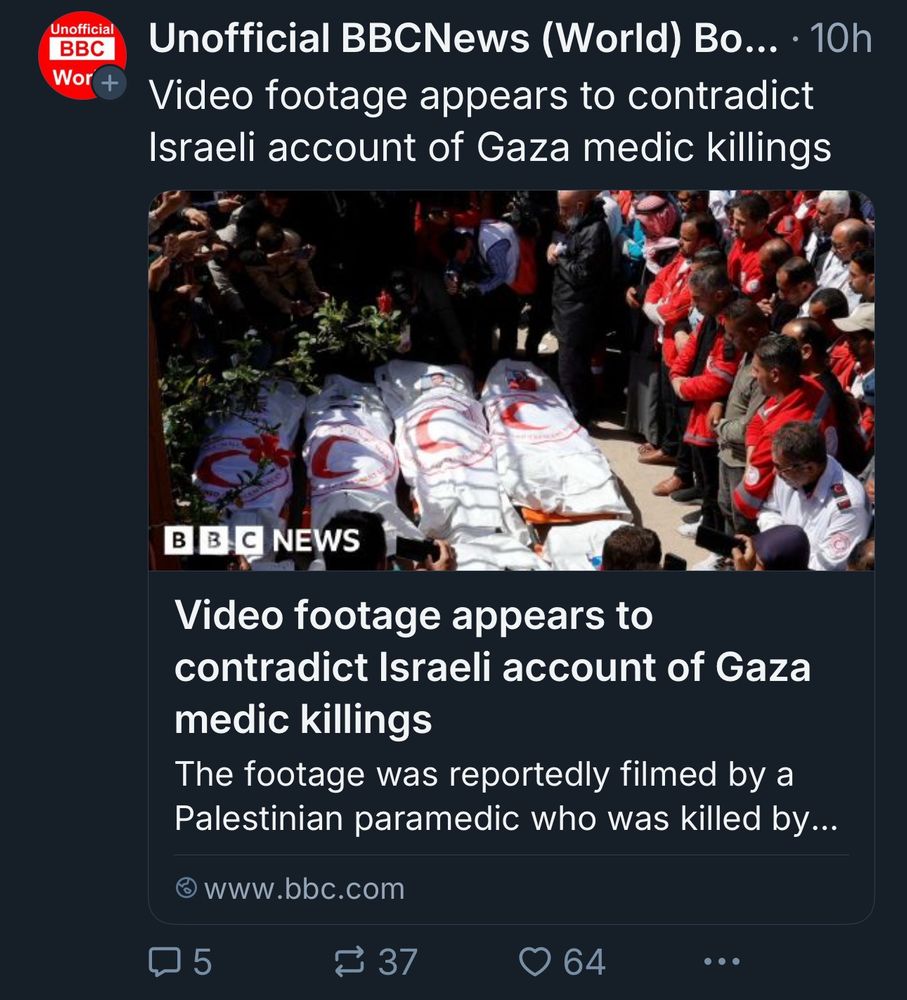 There are a number of problems with this. First, there is no reason to add ‘appears to.’ The video leaves no room for doubt. The Israelis lied. Even the NYT, which is the 4th on this list, published an investigation that makes it clear. Again: the Israelis shot at ambulances and a UN vehicle, executed rescue workers and medics one by one, dumped their bodies in a mass grave, and then buried the vehicles.