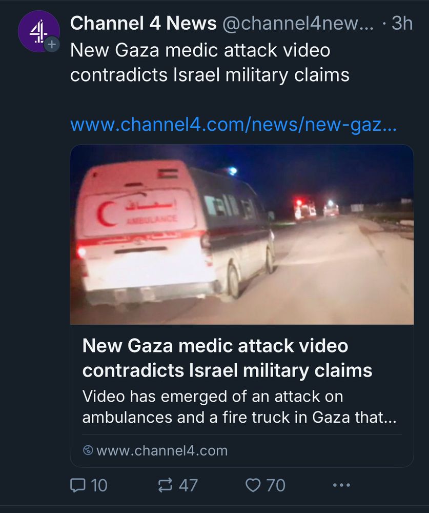 The Channel 4 headline was straightforward: “new Gaza medic attack video contradicts Israel military claims.” It's useful to start with this one because it shows how simple writing a headline can be. Channel 4 simply states the facts. The Israeli military made claims. Those claims have been contradicted by the video. Simple. Channel 4 sees no reason to add doubt, because there is no doubt.