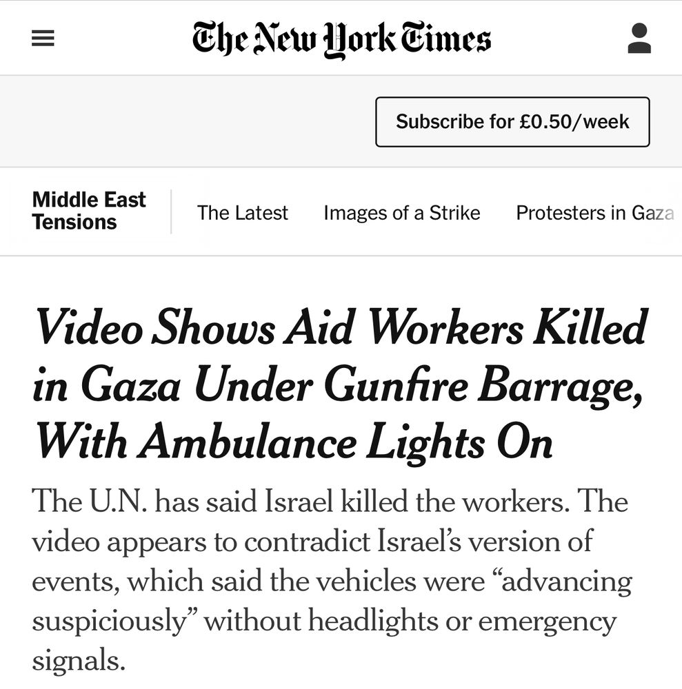 The NYT is arguably the most egregious one of the lot because the article itself is a clear investigation into what happened. But if you only read the headlines - and, remember, most people only read headlines + lede, and the NYT knows that - you get this: “Video shows aid workers killed in Gaza under gunfire barrage, with ambulance lights on.” You may not be familiar, but this is a longstanding problem with NYT coverage of Gaza. Let's dig in.