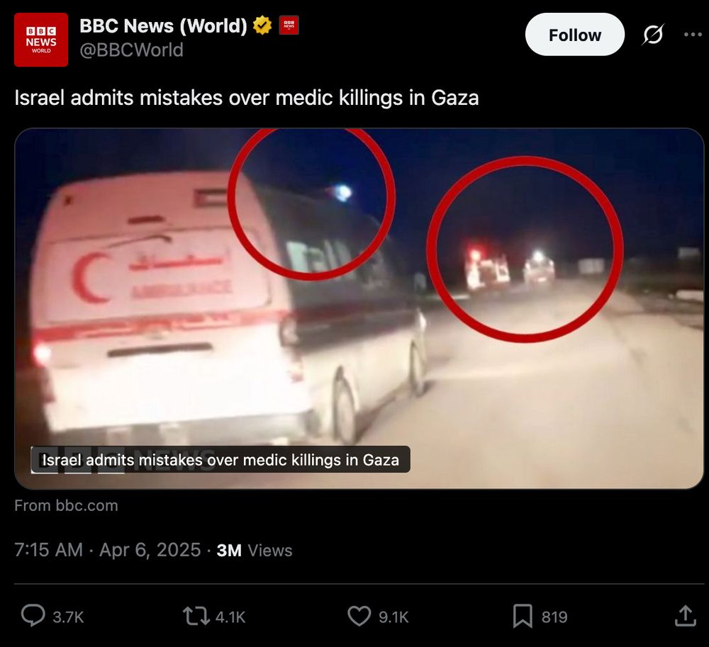 “Israel admits mistakes over medic killings in Gaza.” Mistakes. The Israelis did an oopsie by opening fire on ambulances and a UN vehicle, they did an oopsie by executing rescue workers and medics one by one, they did an oopsie by dumping their bodies in a mass grave, and they did an oopsie by burying the vehicles.