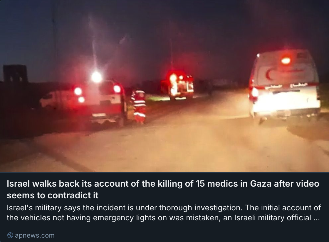 Here's everything AP News did not include: the Israelis opened fire at the vehicles. The Israelis executed the rescue workers and medics - again, one by one. The Israelis buried the vehicles. The Israelis dumped the bodies in a mass grave.