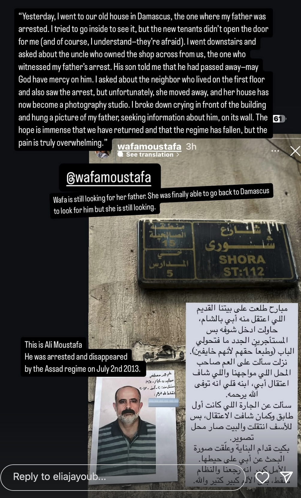 My friend Wafa Moustafa's father, Ali Moustafa, was forcibly disappeared by the Assad regime on the 2nd of July 2013. This was over a year after Bassel was killed.